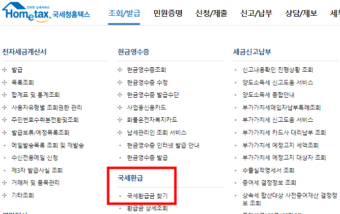 홈택스 홈페이지 접속 → 조회/발급 → 국세환급 → 국세환급금 찾기