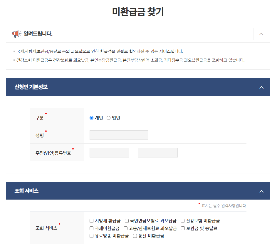 국세, 지방세, 보관금 및 송달료, 건강보험 미환급금 등의 과오납으로 인한 환급액을 일괄로 확인하고 일부 미환급금은 통합 신청을 제공하는 서비스입니다.