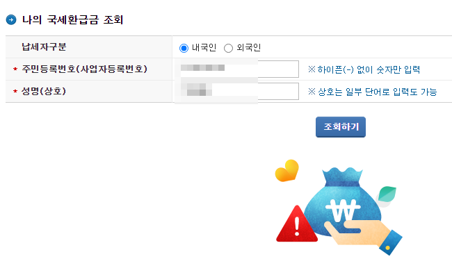 - 국세미환급금 : 조회 및 개인·법인 환급 신청 가능